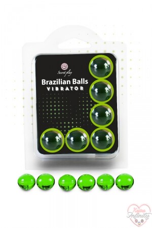 Blister contenant 6 Brazilian Balls. Elles sont fabriquées au Brésil et vendues sous la marque Espagnole Secret Play. Elles se dissolvent avec la chaleur du corps et se transforment en liquide stimulant et lubrifiant.
