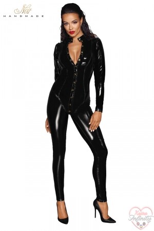 Combinaison intégrale en vinyle très originale avec sa coupe cintrée et ses pressions dorées.