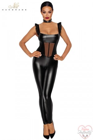 Combinaison en wetlook élégante et très élaborée, avec un plastron de tulle sur le ventre.