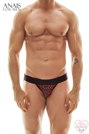 Le Jock strap Tribal fabriqué en Europe par la marque Anaïs for Men. A l’avant, la coque est fabriquée en tissu élastique imprimé animal à dominante rouge et noire. A l’arrière, il laisse tout paraitre grâce à sa coupe en forme de jockstrap.