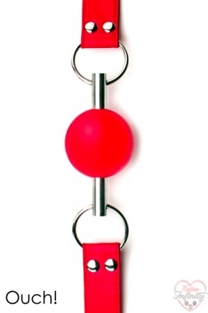 Un Bâillon boule original avec balle en caoutchouc traversée par une tige en métal reliée aux sangles à laide de deux anneaux. Proposé par Ouch!