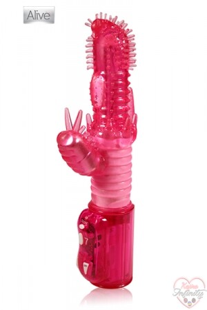 Un vibromasseur double action avec stimulation vaginale et stimulation du clitoris des zones de contacts recouvertes de picots pour accroitre les sensations…